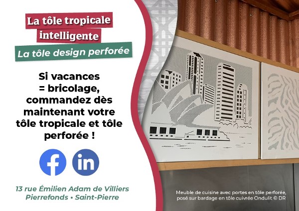 Et, face aux demandes pour la décoration des bâtiments réalisés, en 2019, nous avons étendu notre offre de services en proposant la Tôle design perforée par un process unique à La Réunion, destinée tant aux professionnels qu’aux particuliers.