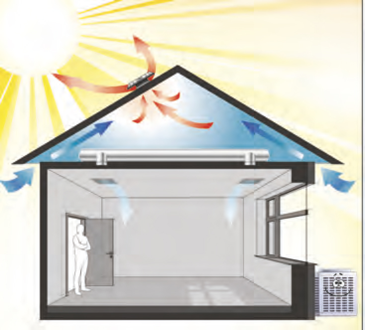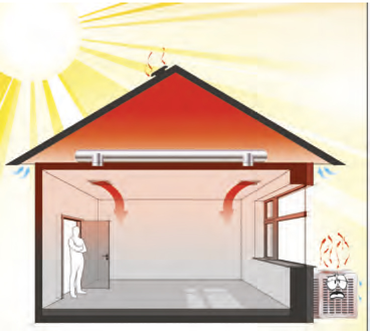 Le rayonnement solaire sur les toitures fait monter fortement la température dans les combles, notamment en été. Cette chaleur qui s’accumule est diffusée ensuite à l’intérieur de l’espace, empêchant ou ralentissant le refroidissement naturel des pièces attenantes. Or, la plupart des bâtiments ne parviennent à évacuer assez d’air pour sortir la chaleur et/ ou l’humidité.