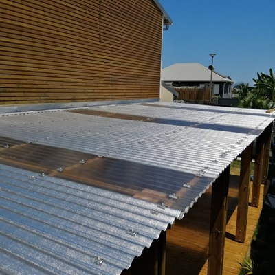 Tôle Ondulit en aluminium naturel, polycarbonate ondulé, sur terrasse ouverte.