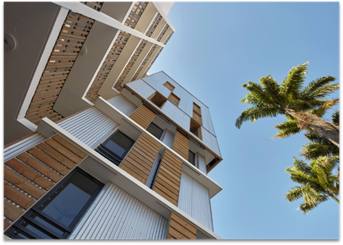 Coeur de ville La Possession - Bardage Ondulit cuivre, finition Ondulit aluminium - Photo H. Douris